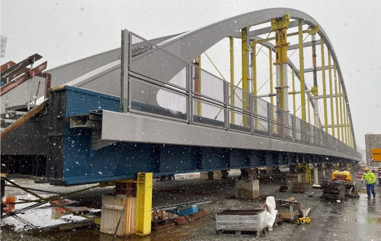 Im Zuge der Regionaltangente West (RTW) – einer neuen tangentialen Schienenverbindung im Rhein-Main-Gebiet – entsteht im Abschnitt „Süd 1“ eine markante Stabbogenbrücke im Bereich Frankfurt-Stadion. Das Bauwerk überführt die neue RTW-Trasse ohne Zwischenstützen über ein dicht belegtes Gleisfeld; die Bauform ermöglicht die große Spannweite, ohne in den Gleisbereich eingreifen zu müssen. Die Brücke wurde in der Nähe (Parkplatz „Gleisdreieck“) vormontiert und anschließend in einer Sperrpause präzise in Endlage eingehoben/eingeschoben.