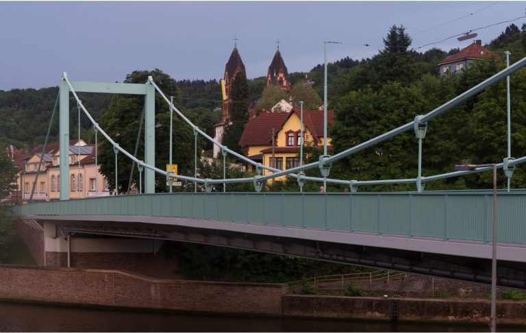 Die Saarbrücke Mettlach ist eine markante, denkmalgeschützte Stahl-Hängebrücke und verbindet die Ortslage Mettlach mit dem gegenüberliegenden Ortsteil Keuchingen. Im Rahmen der Bearbeitung 2021 wurden eine objektbezogene Schadensanalyse (Zustandserfassung, Bewertung und Ursachenanalyse) sowie eine Nachrechnung des Bestandsbauwerks durchgeführt. Die Ergebnisse dienten als Grundlage für die Beurteilung der Tragfähigkeit und Gebrauchstauglichkeit sowie für die Ableitung von Erhaltungs- bzw. Instandsetzungsmaßnahmen.